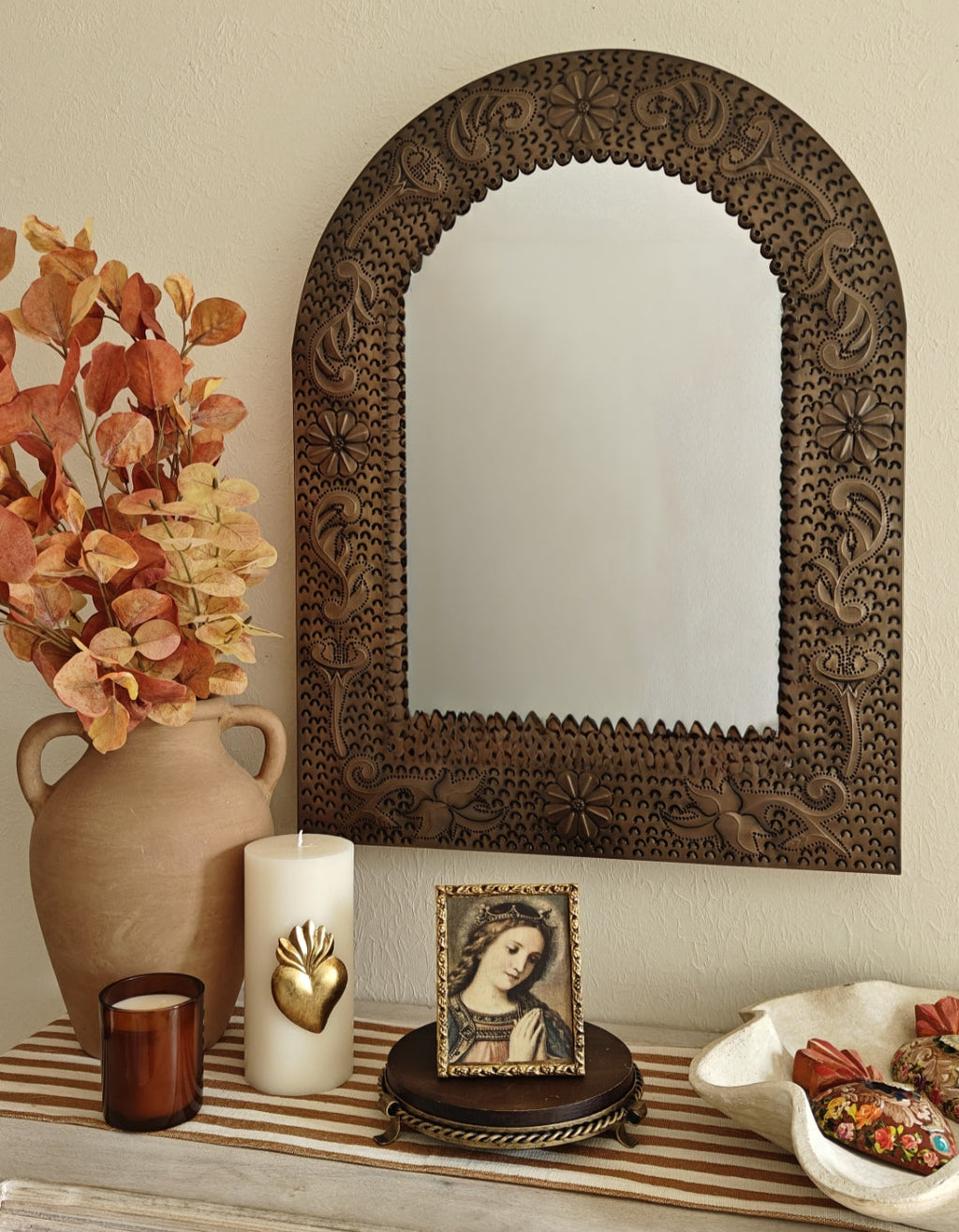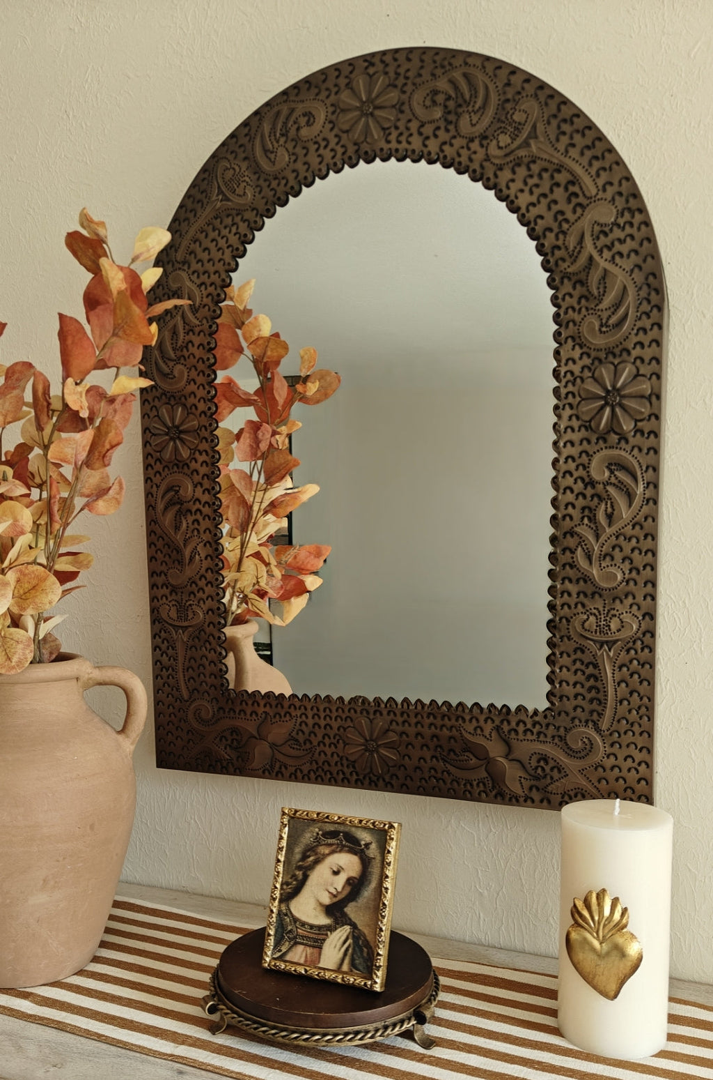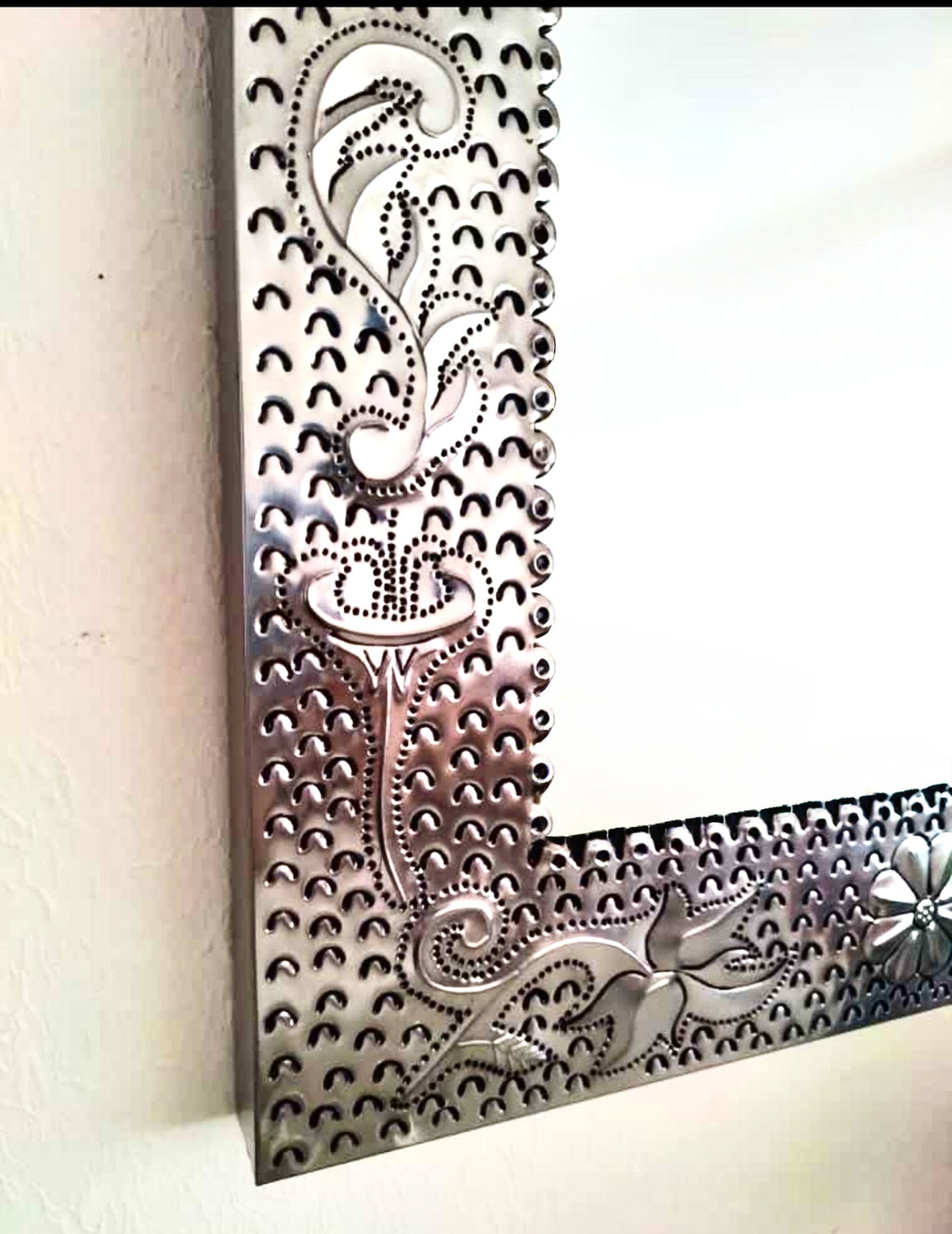 A timeless and elegant piece. Each section of this artisanal mirror is carefully handcrafted to perfection. Hang it in your living room, family room or bedroom and see how it adds charm and a touch of art to any space. Handmade in San Miguel de Allende by generations of talented artisans.