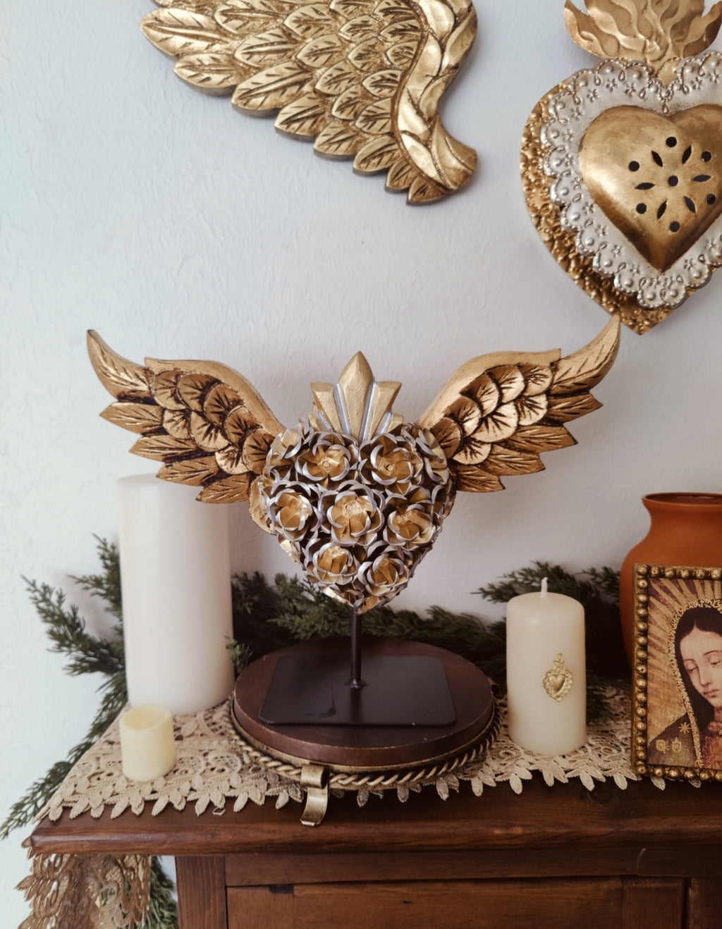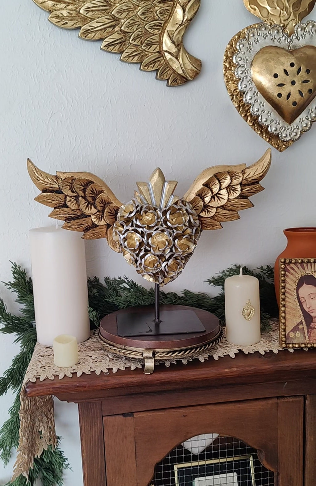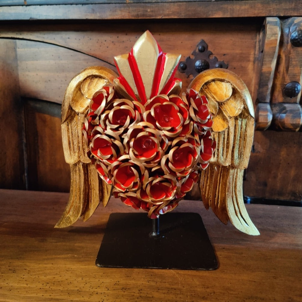 Talk about making a statement. This exquisite piece will turn heads anywhere you place it. This beautiful corazon comes with a base for an enchanting and stunning display. The heart is made of carved wood and decorated with intricately crafted tin roses The hand carved wooden wings add a special touch that makes this piece even more exquisite and unique.