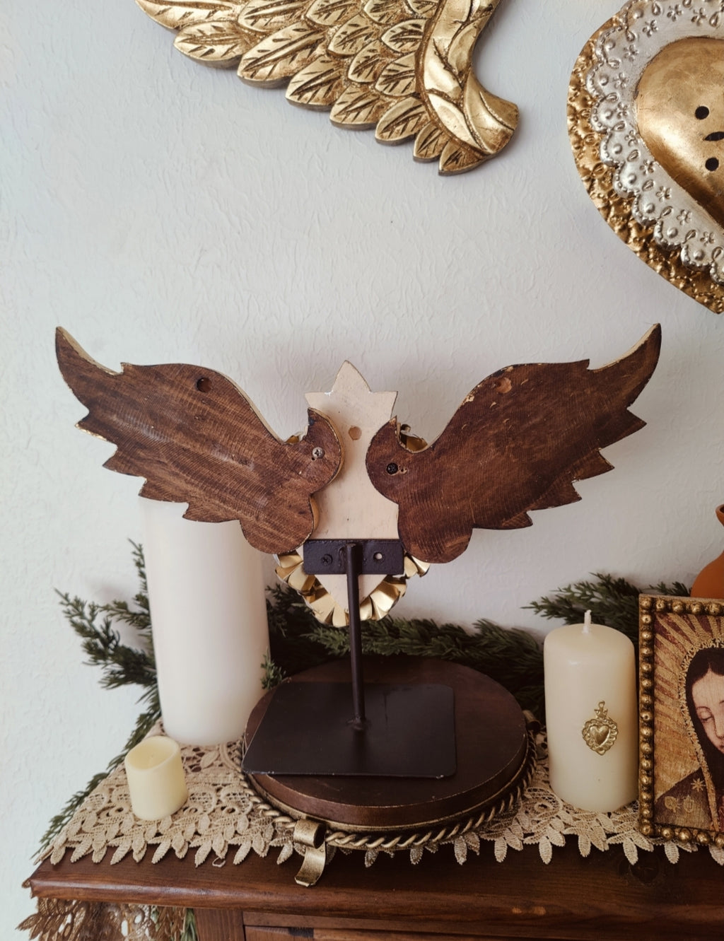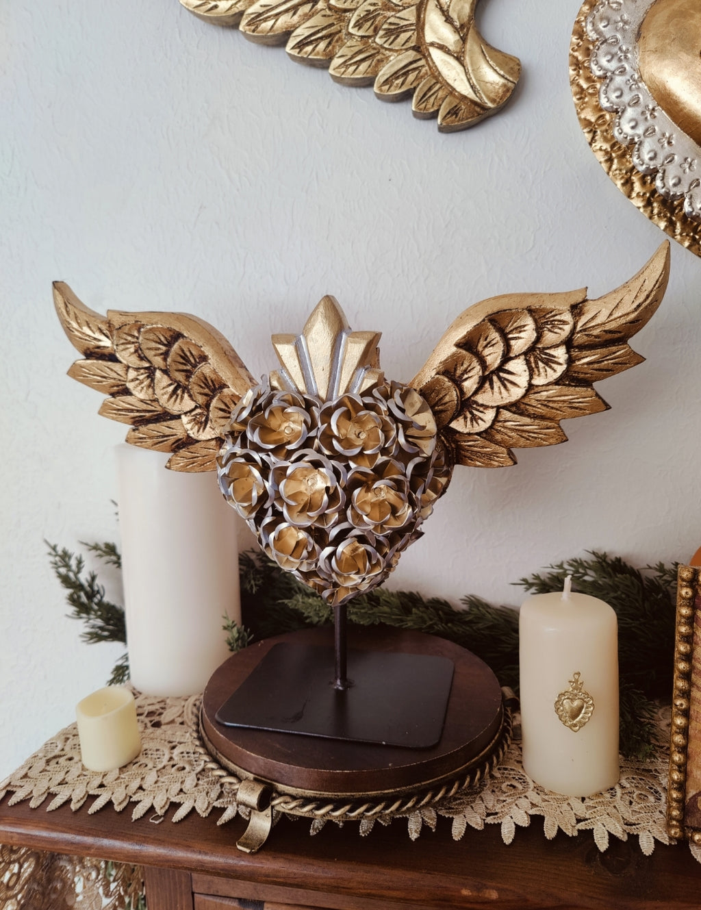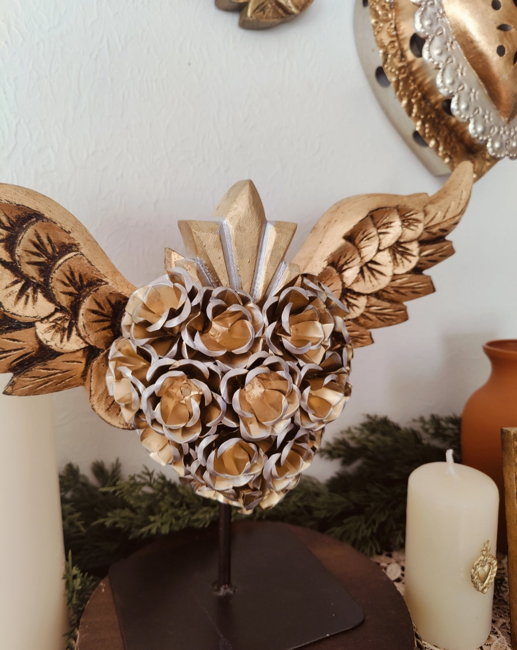 Talk about making a statement. This exquisite piece will turn heads anywhere you place it. This beautiful corazon comes with a base for an enchanting and stunning display. The heart is made of carved wood and decorated with intricately crafted tin roses The hand carved wooden wings add a special touch that makes this piece even more exquisite and unique.