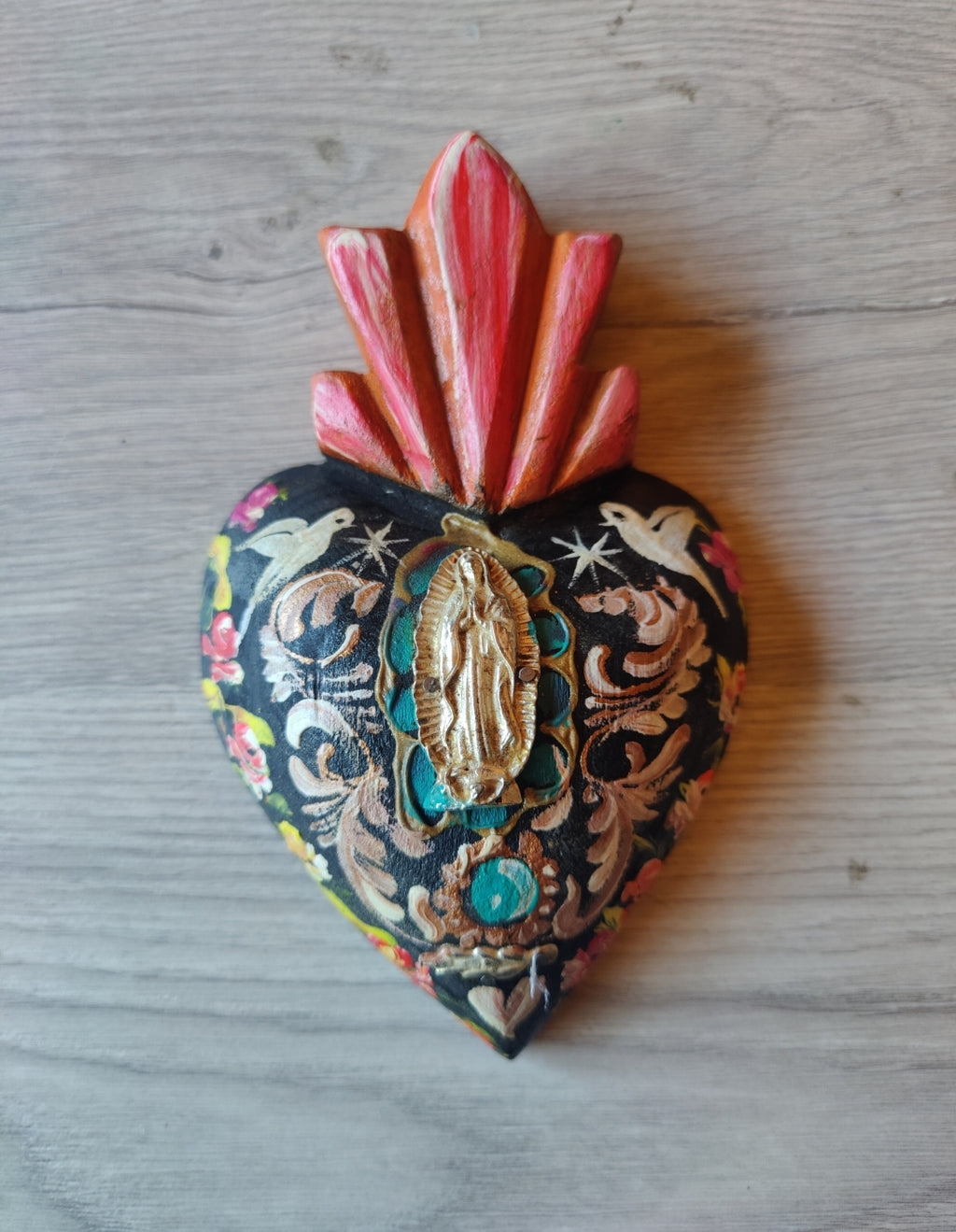 The sacred heart is one of the most common motifs in Mexican folk art. Embellished with a milagro charm and  religious image, these accent pieces add artisanal, colorful and richness to your décor.
