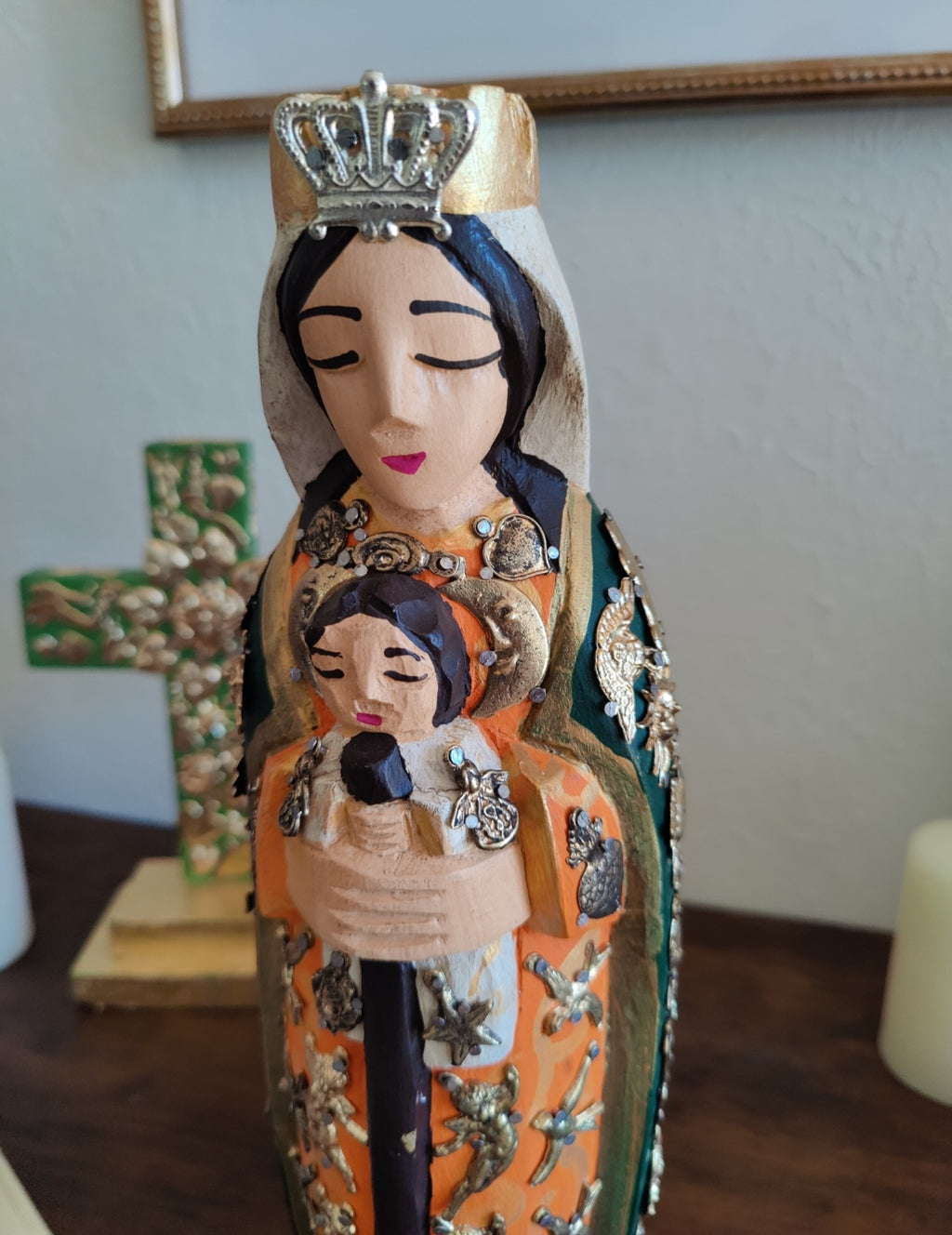 Each Virgencita is entirely handmade by skilled artisans in Mexico, making every piece truly one of a kind. The hand-painted details, carving, and placement of milagritos vary from piece to piece, ensuring that no two figures are ever exactly alike.