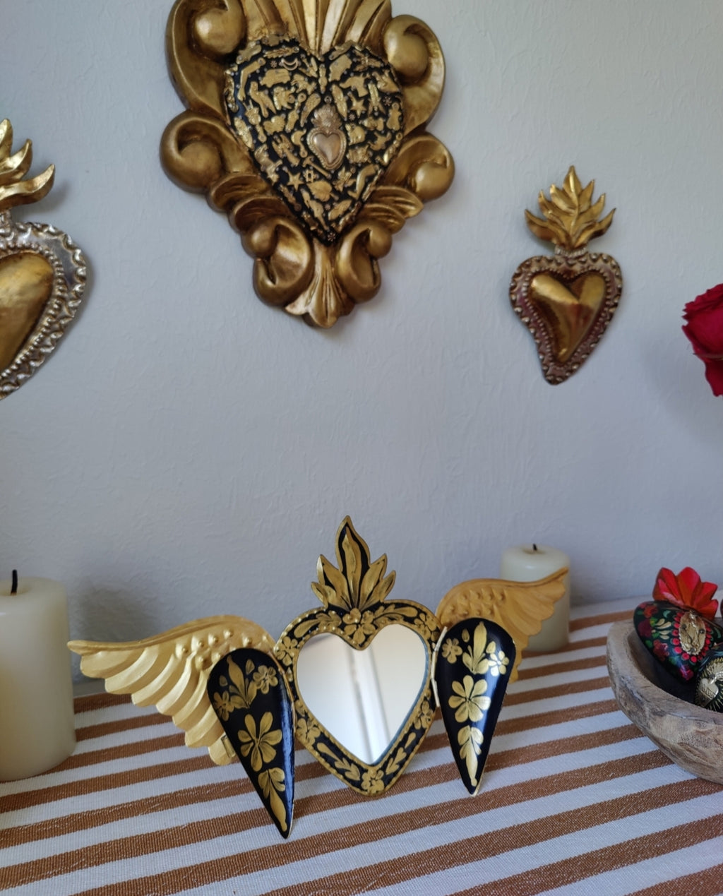 This stunning and one of kind corazon mirror is a customer favorite! Designed and inspired by one of Frida's famous phrases, "Feet what do I need you for when I have wings to fly." It will look absolutely beautiful on any wall or table in your home.