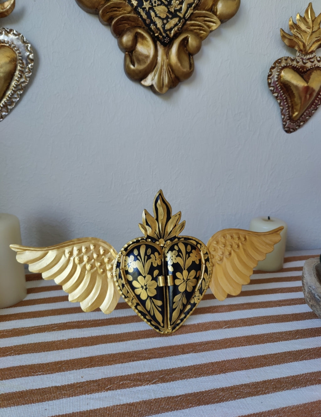 - Handcrafted out of tin and decorated with gold flowers