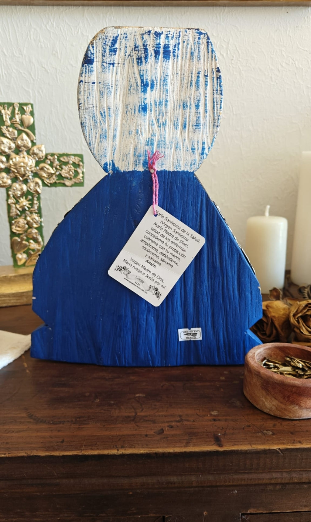 This beautiful representation of Virgen de la Salud is a handcrafted piece of Mexican devotional folk art. Each Virgencita is carefully hand-carved in wood and decorated with traditional milagritos, small sacred charms that symbolize prayers, gratitude, protection, and healing.