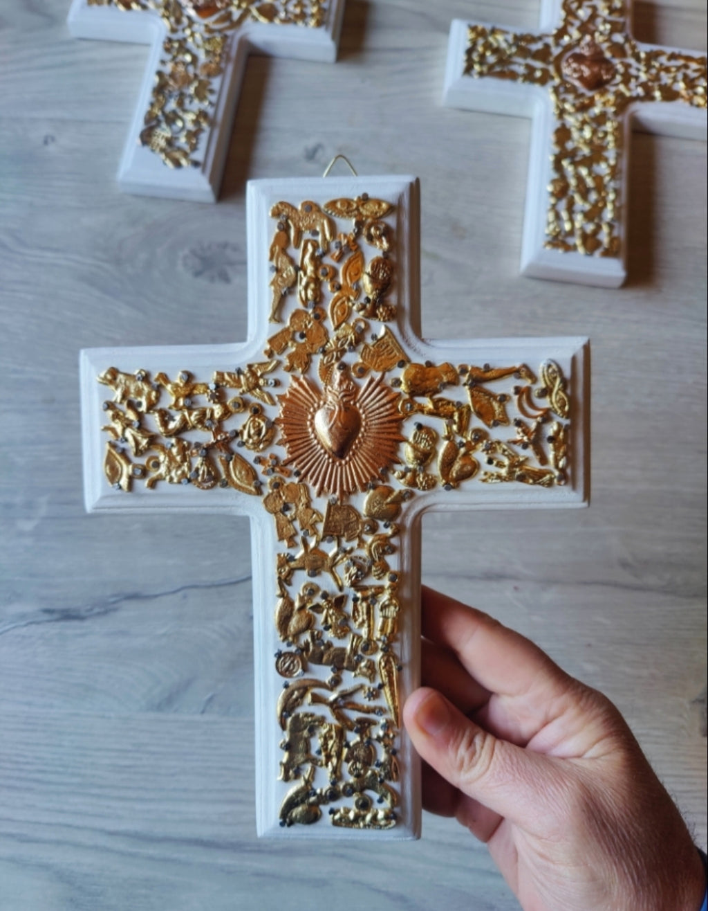 Handmade wooden carved cross painted white with gold painted Milagritos added and more tin decorations .